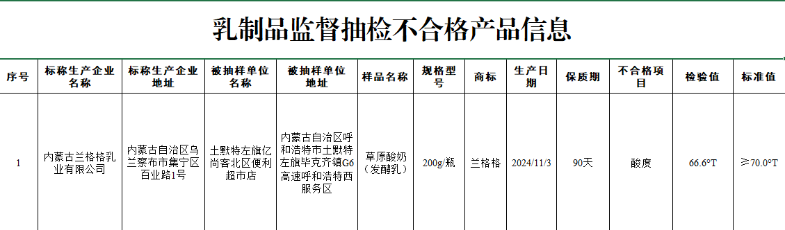 近日,市场监管总局办公厅发布食物抽检不及格环境的传递,1批次标称兰格格乳业无限公司出产的草原酸奶(发酵乳),被检出酸度不达标。