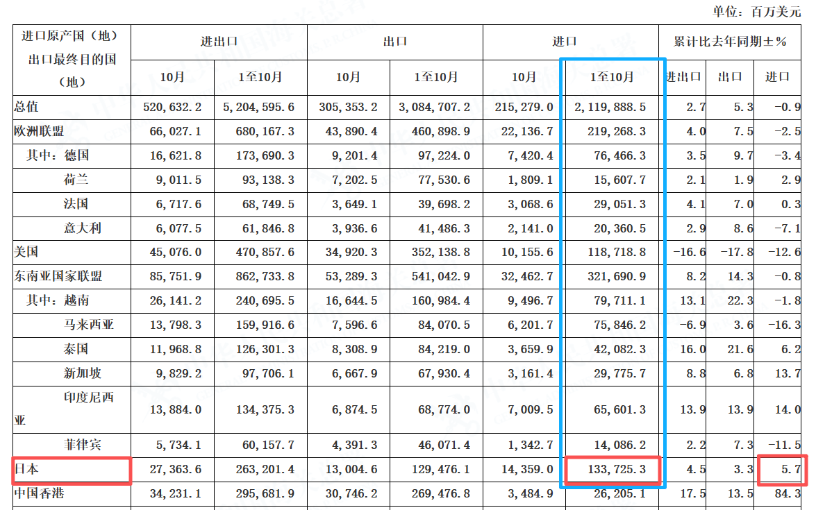 中日经济彼此交融,大师各取所需、配合成长,但这都是成立正在中日关系敌对的根本上,当该根本之时,本年前10个月,日本对华进口总额为1337亿美元,同比增加5。7%,仅次于中国地域和韩国位列第三,高于美国、俄罗斯和整个非洲。